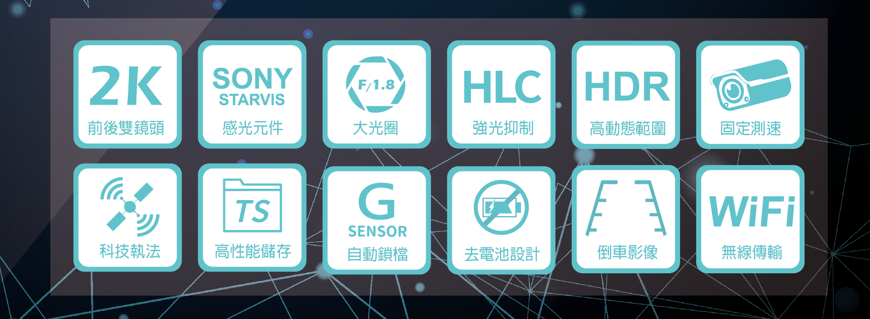 ◆ 前2K 後2K雙鏡頭 ◆ 前後雙Sony Starvis 夜間拍攝依然清晰 ◆ 大光圈F/1.8 ◆ HDR高動態範圍亮暗細節更細膩 ◆ 支援WiFi APP ◆ 支援 HLC 強光抑制 ◆ G-SENSOR 自動鎖檔功能 ◆ 天眼級GPS測速預警